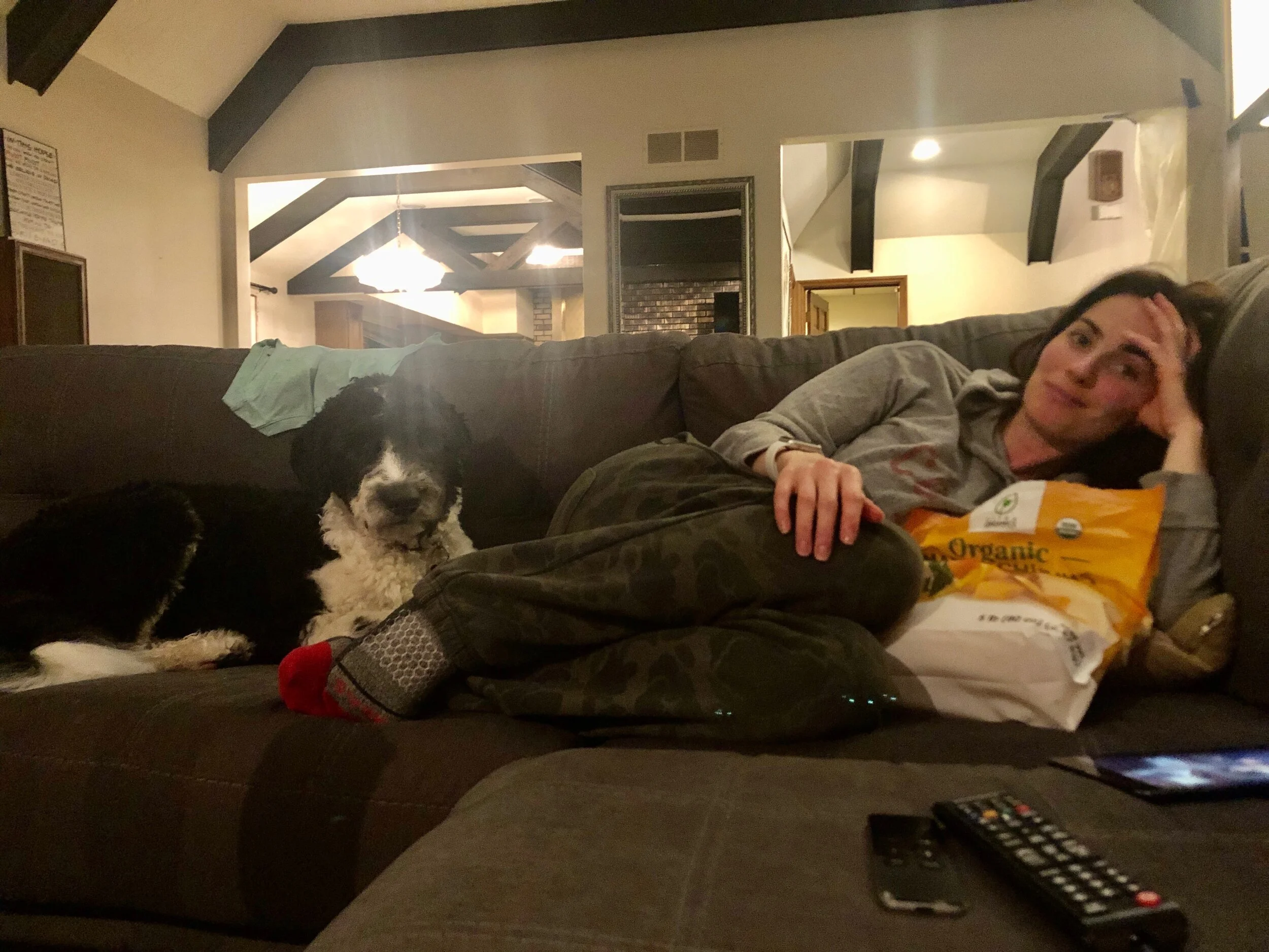 You know how last week I was complaining about not having morning sickness? I should have just been grateful. I got to experience it this week. The only thing that sounded good and would give me energy was frozen mango or a fruit smoothie. Chicken? Don't even say the word. Thankfully, it never lasted all day or even every day. A few times when it hit, I remember thinking to myself, "I can't do this. How do women do this?" Cooking was out of the question. The mix of smells was too overwhelming. One time Vito was making toast while I was peeling a grapefruit and I had to leave the kitchen. Here is a glorious photo that Vito snapped of me eating frozen mango out of the bag feeling like death.